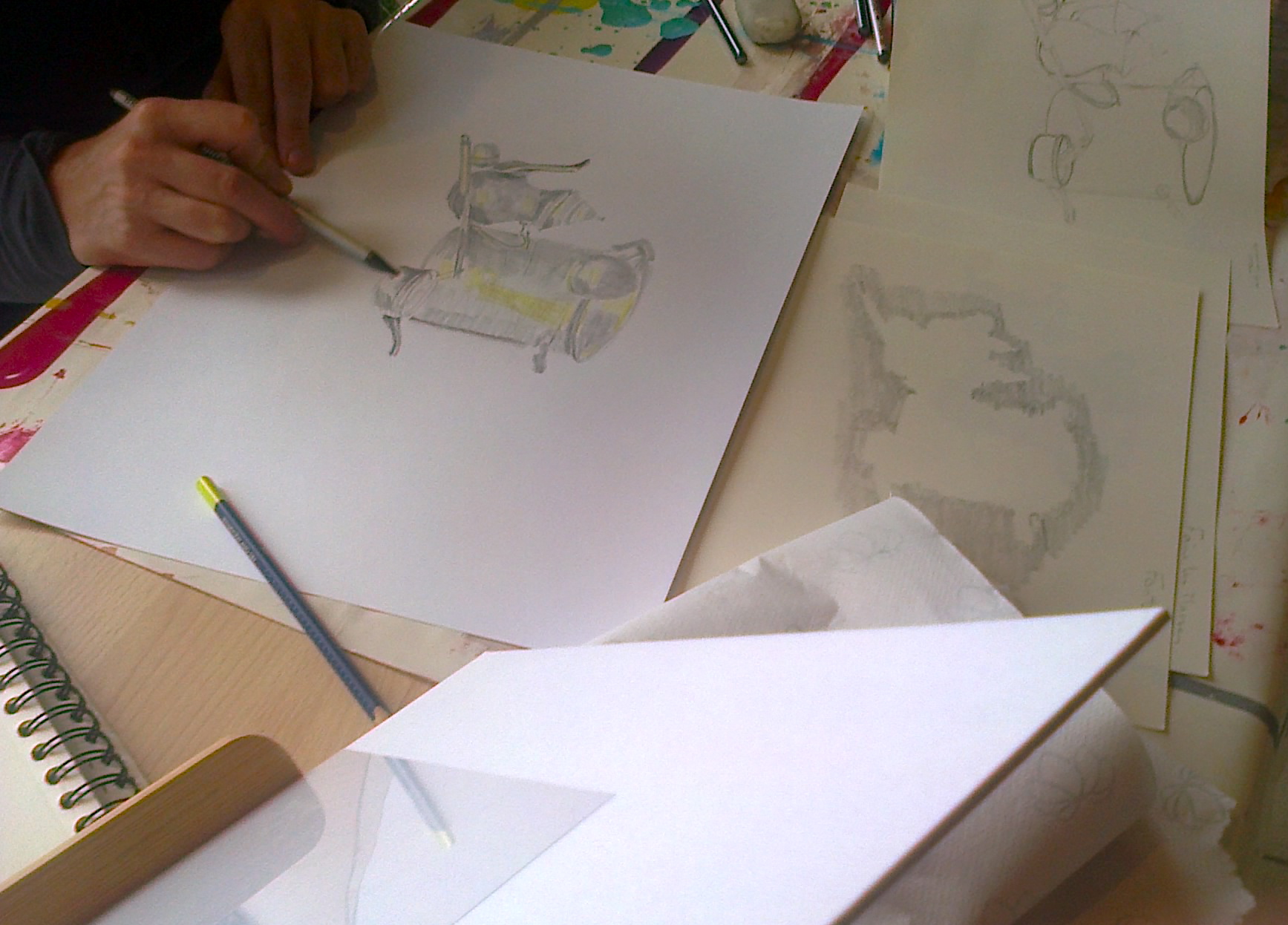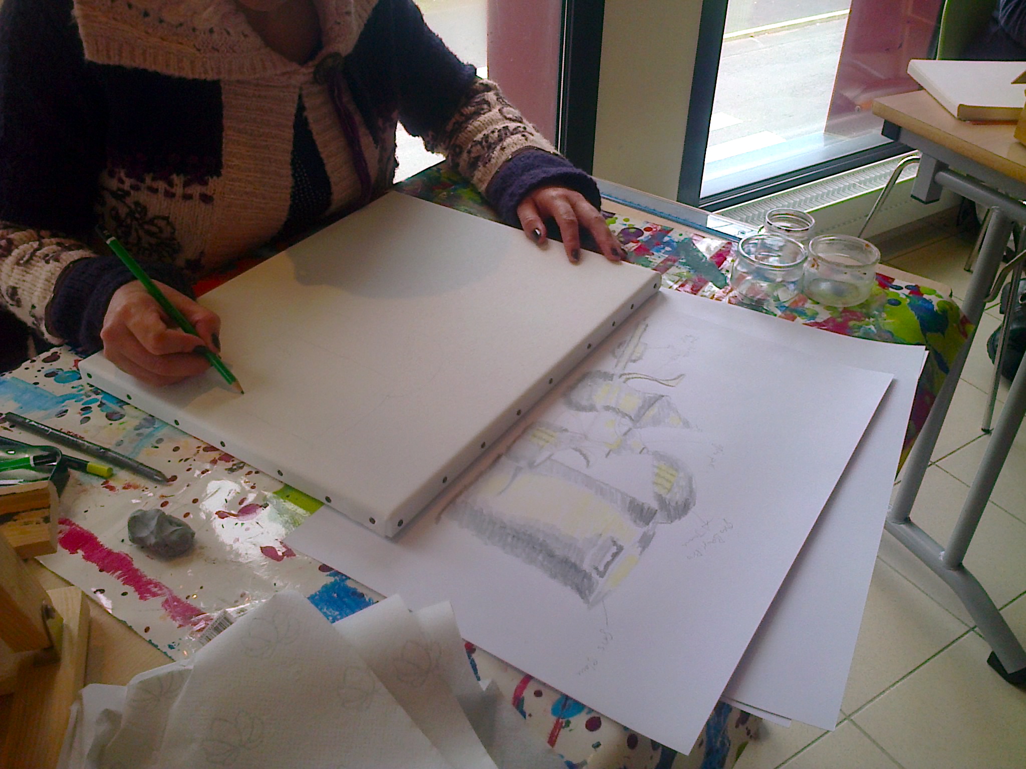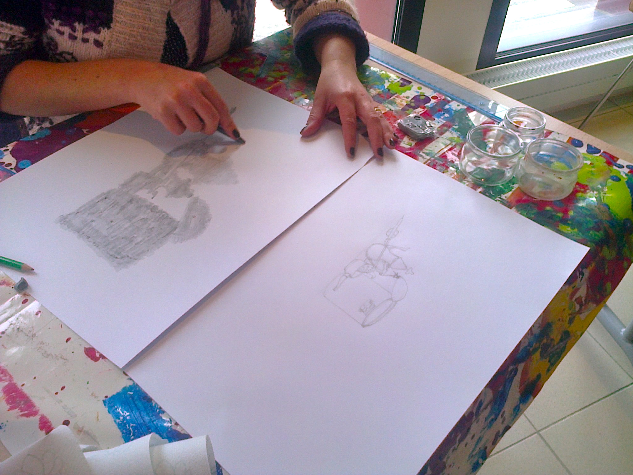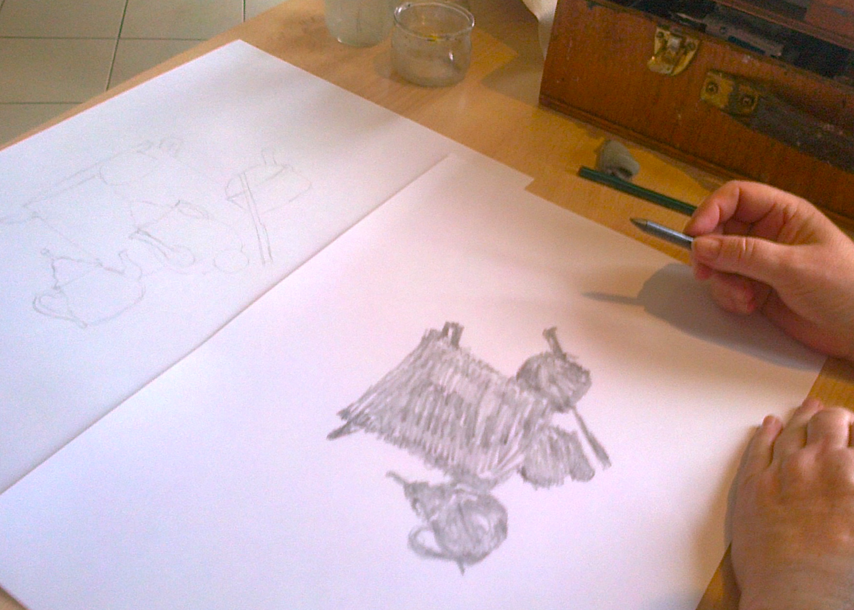 Vue de travail 1Vue de travail 2Vue de travail 3Vue de travail 41ère étape de travail : dessin d’observationAutre étape de travail : réaliser en observant la version « masse » puis la version « fantôme » des éléments devant soi…version « masse »et enfin repérer les zones d’ombres fortes et celles de lumière forte