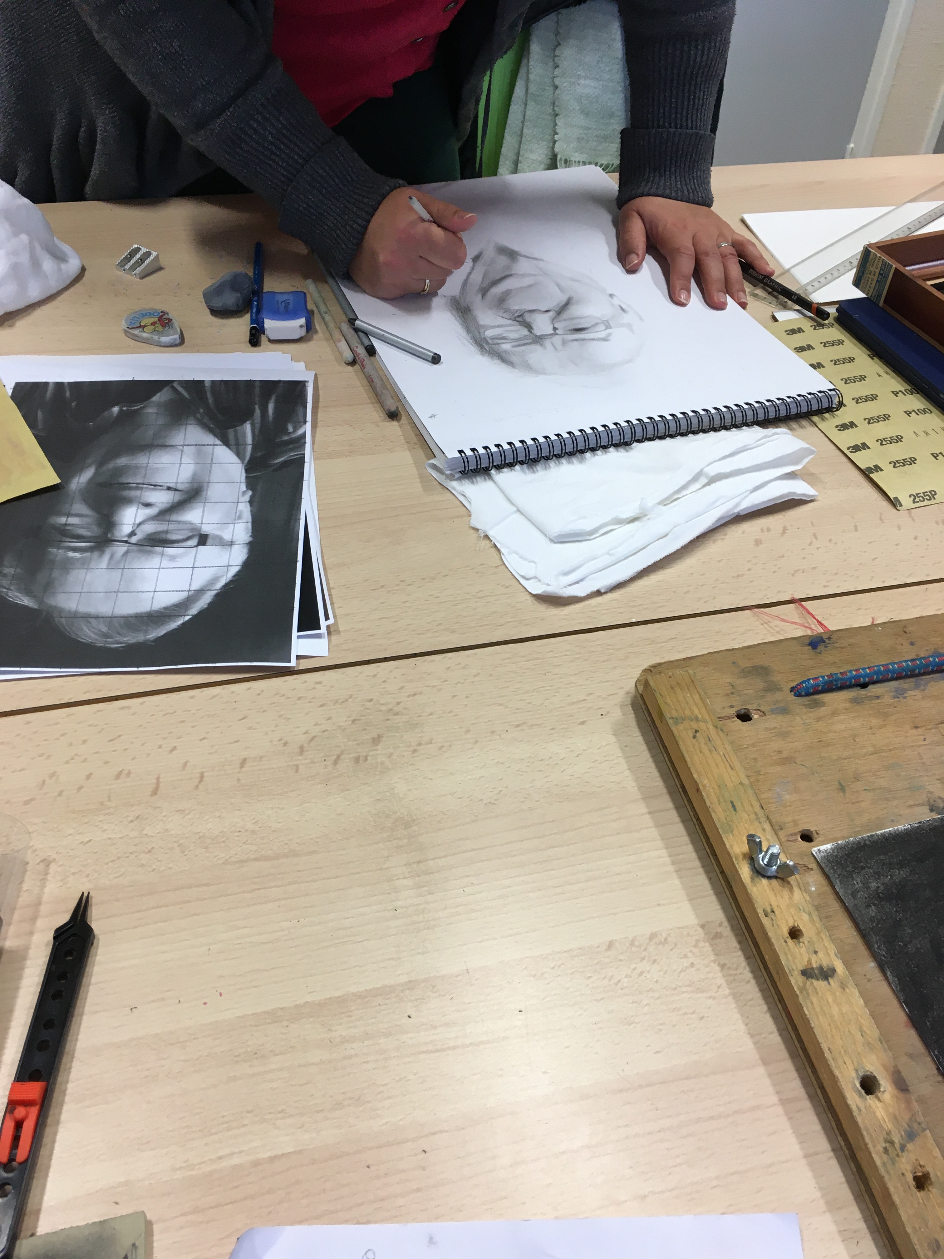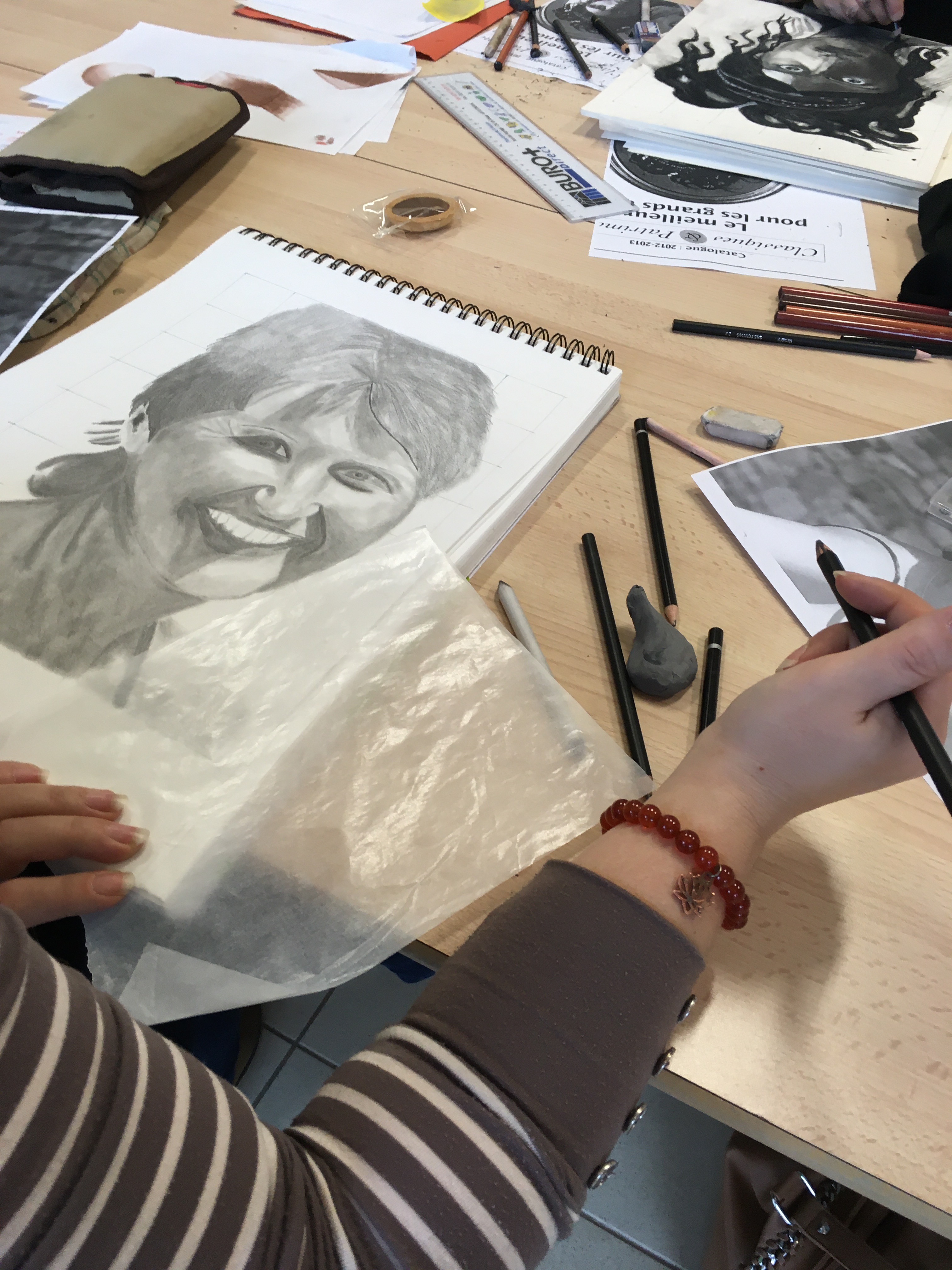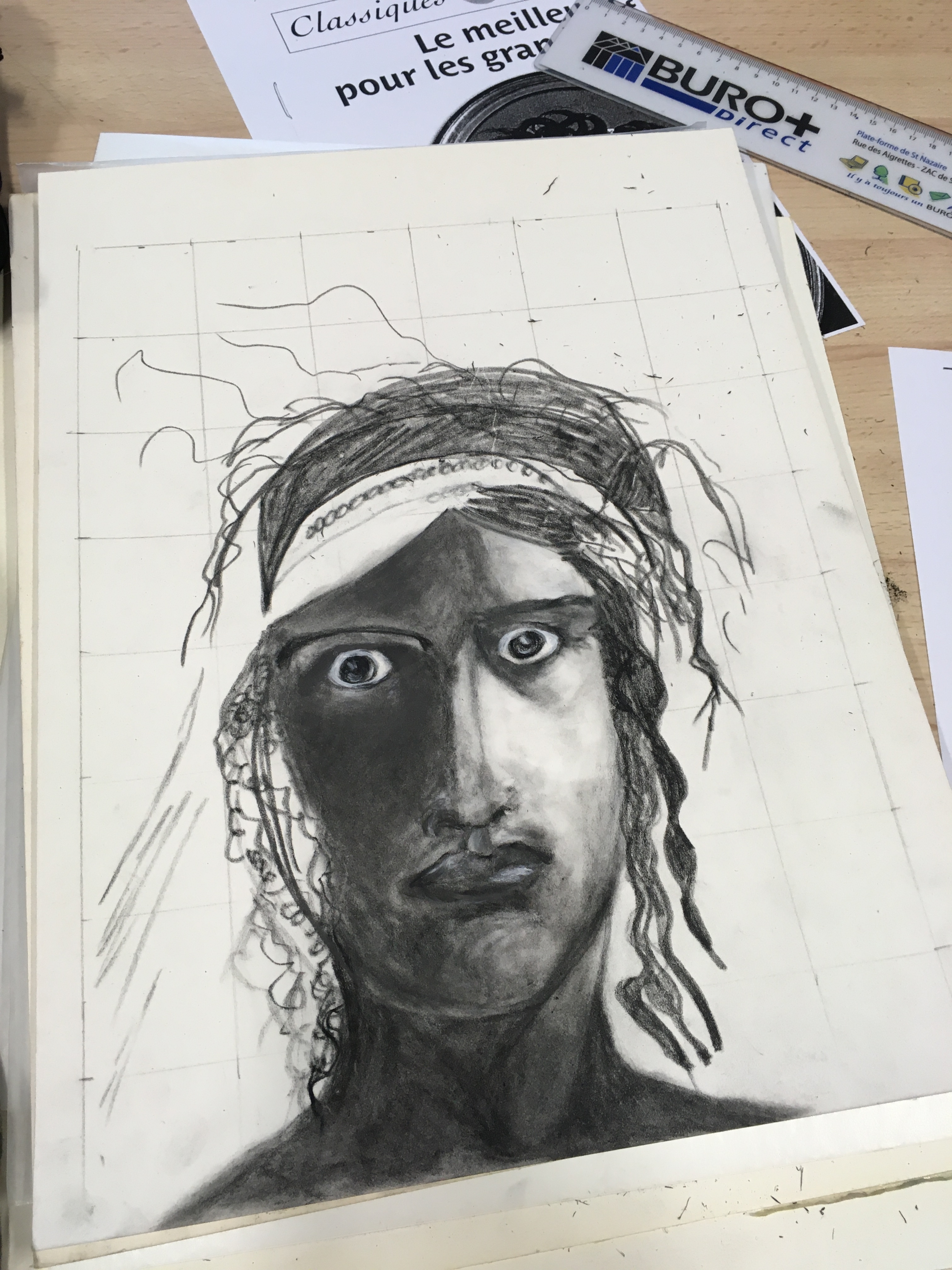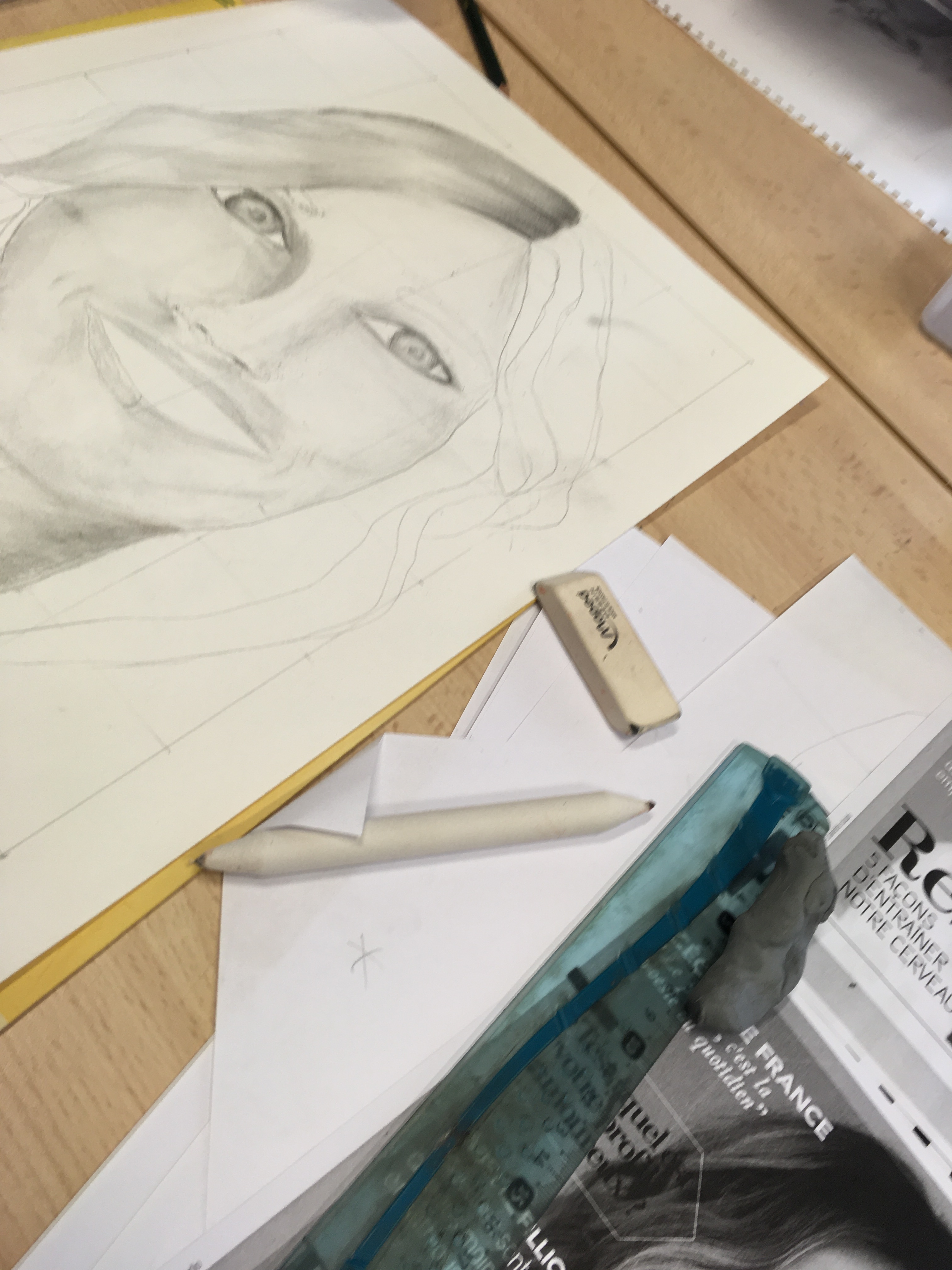 Tout d’abord et pour facilité le travail (le temps nous ai compté !) quadrillage des supports de travail… et aussi quelques photocopies de noir et blanc des visages !
