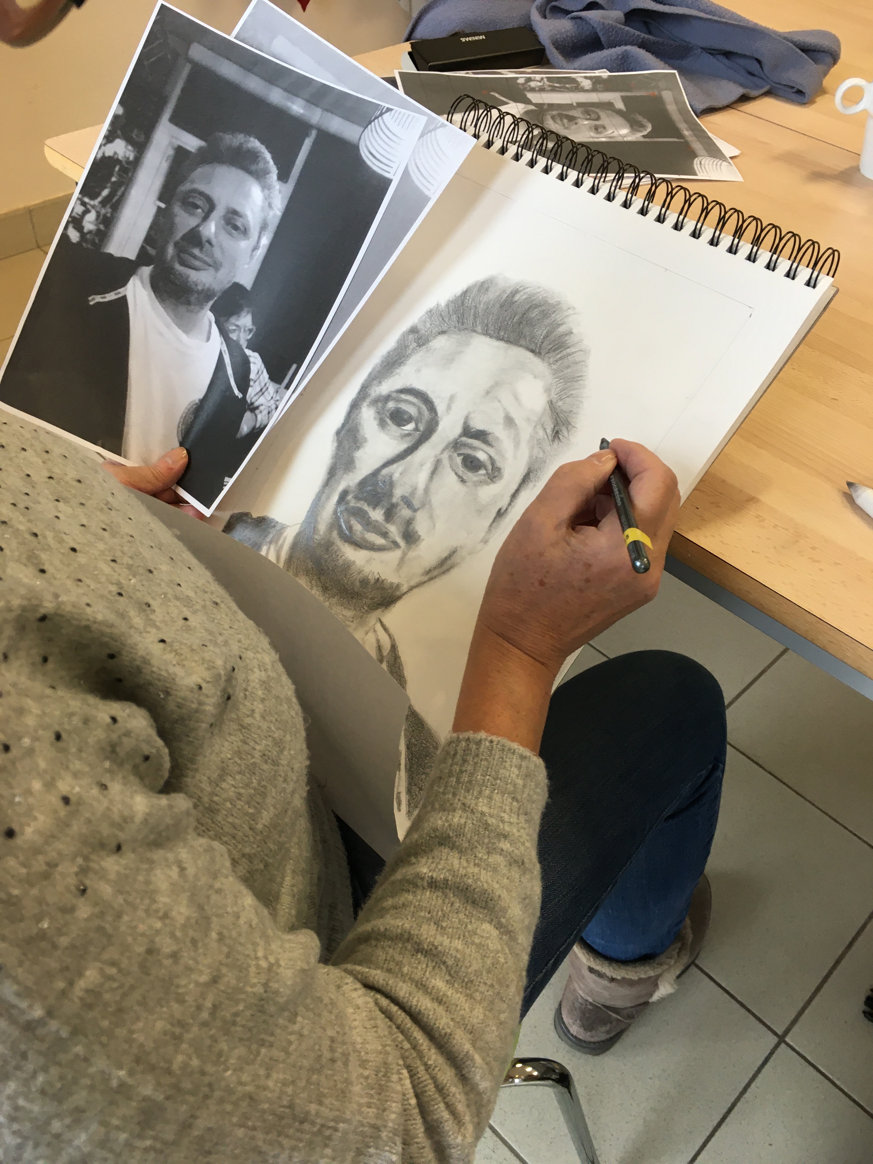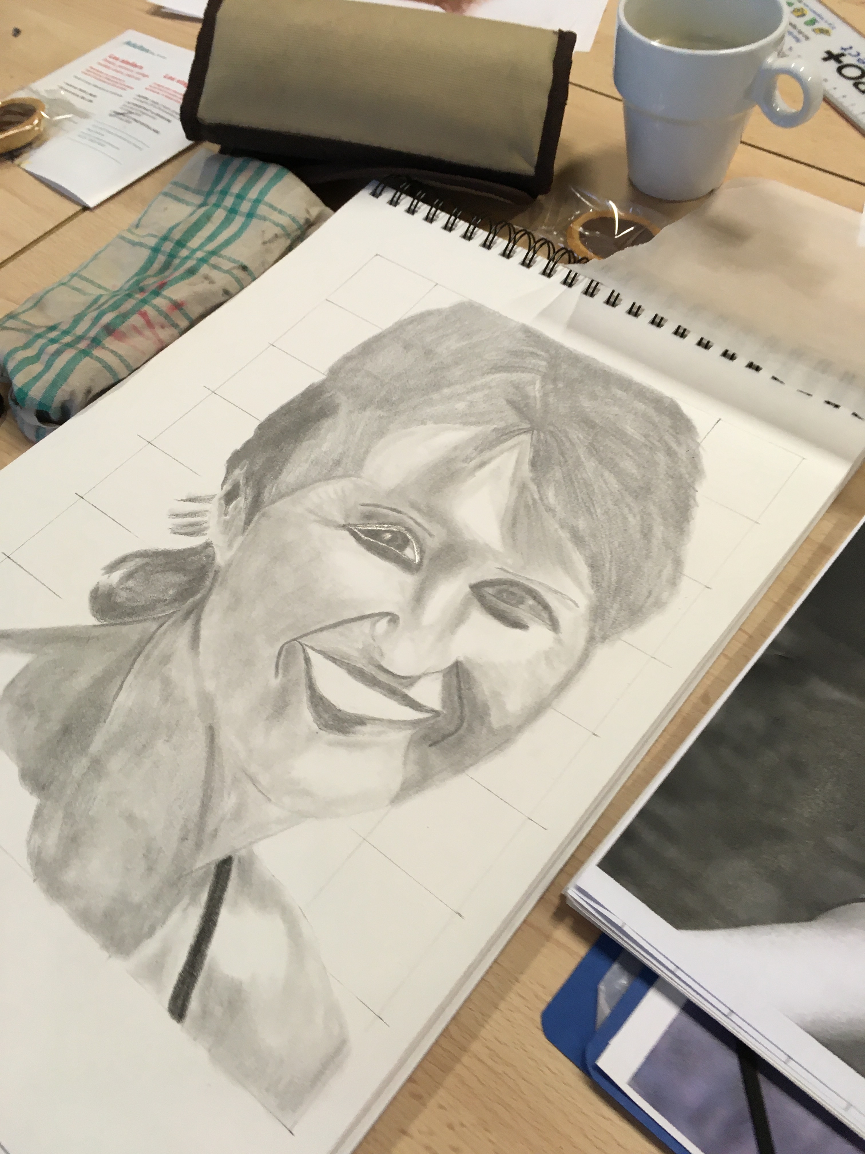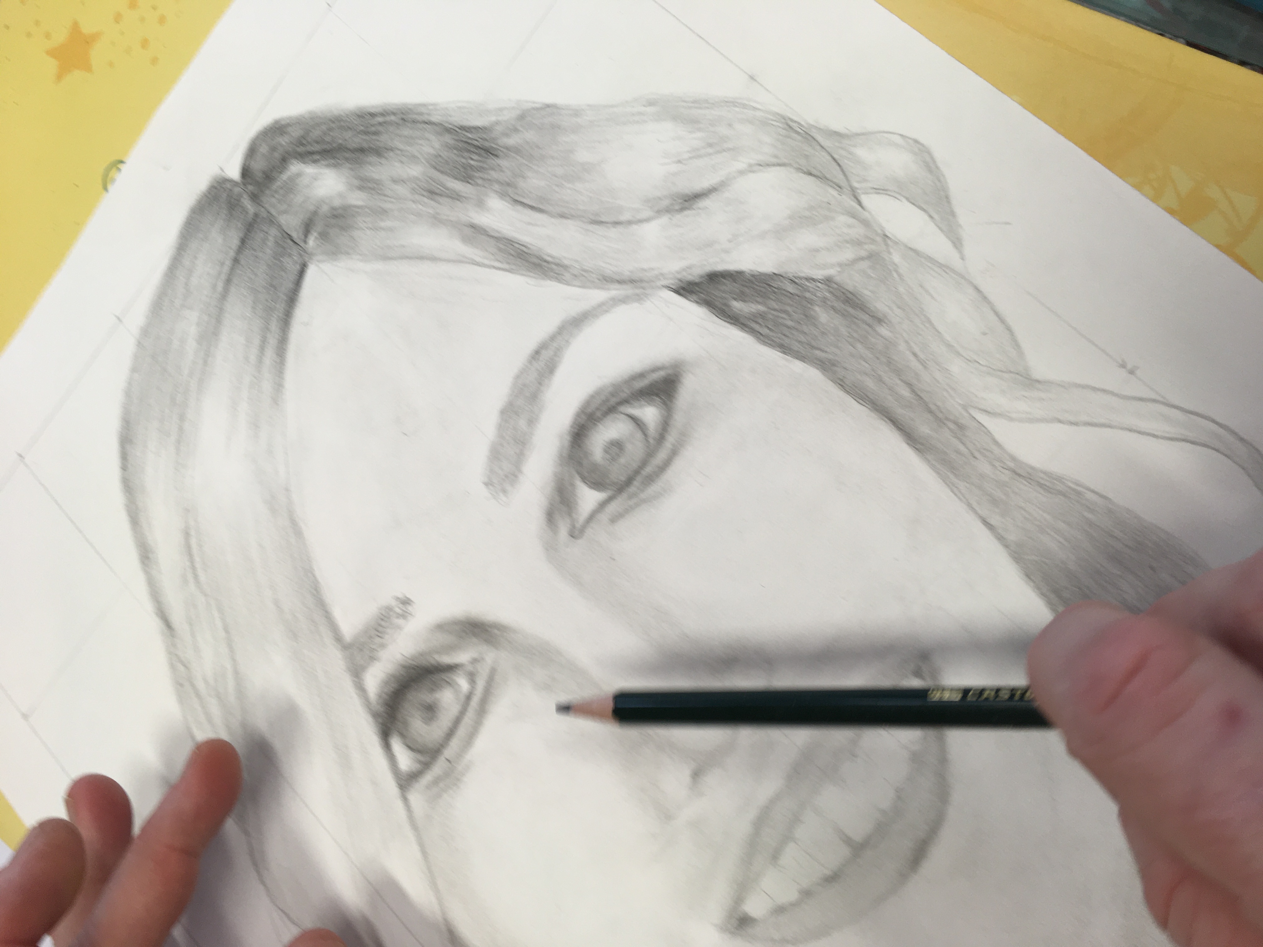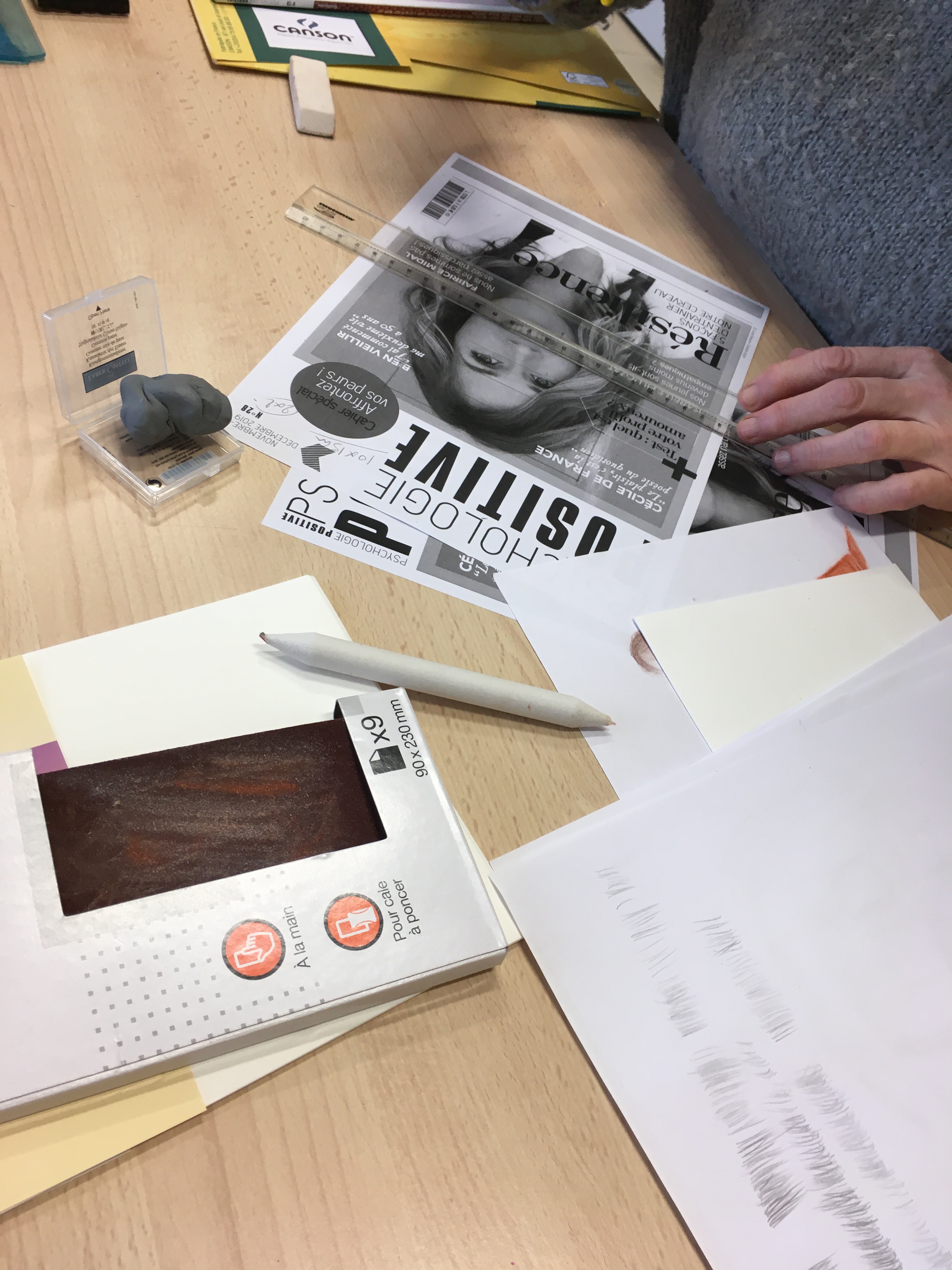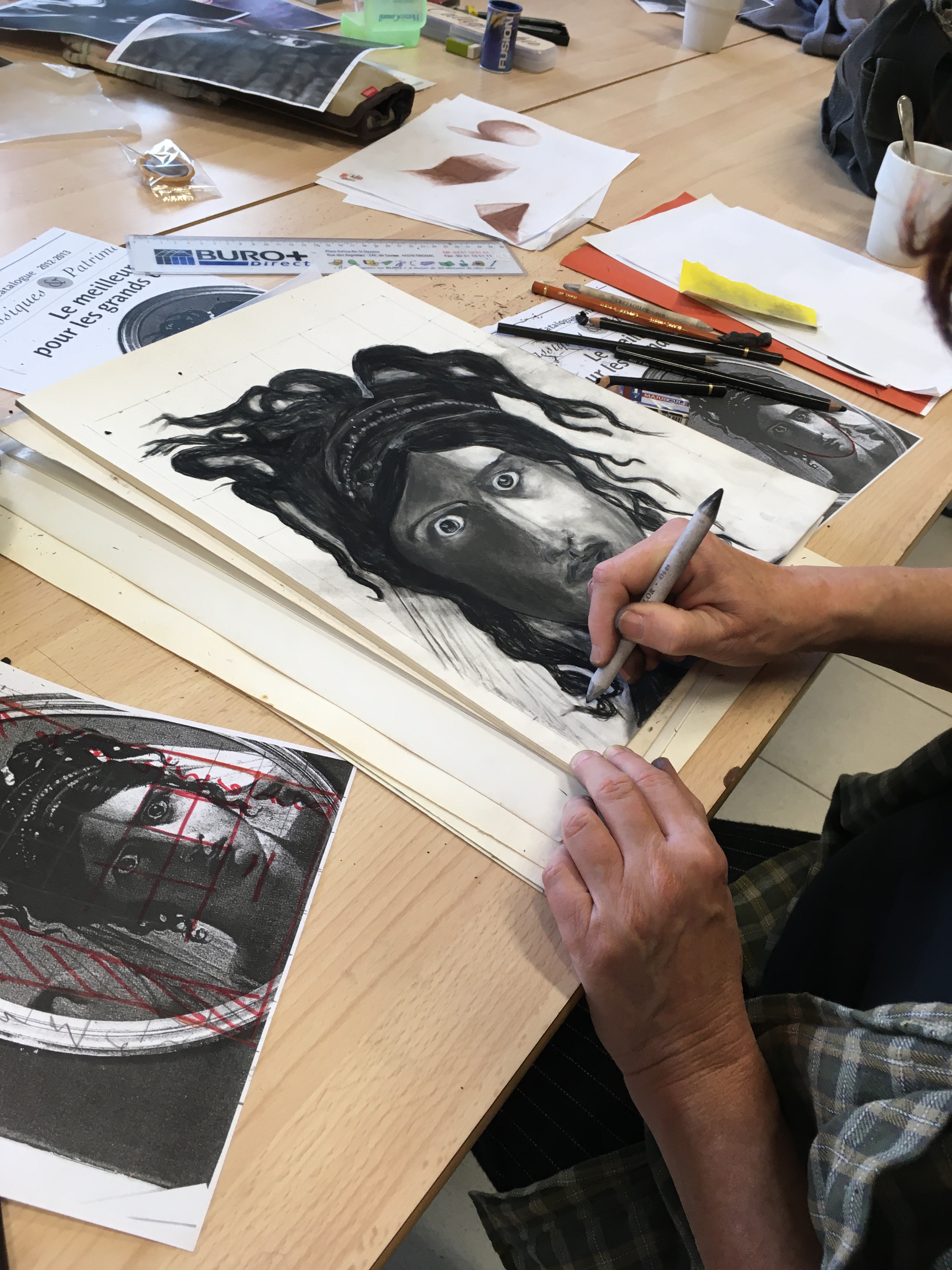 Tout d’abord et pour facilité le travail (le temps nous ai compté !) quadrillage des supports de travail… et aussi quelques photocopies de noir et blanc des visages !