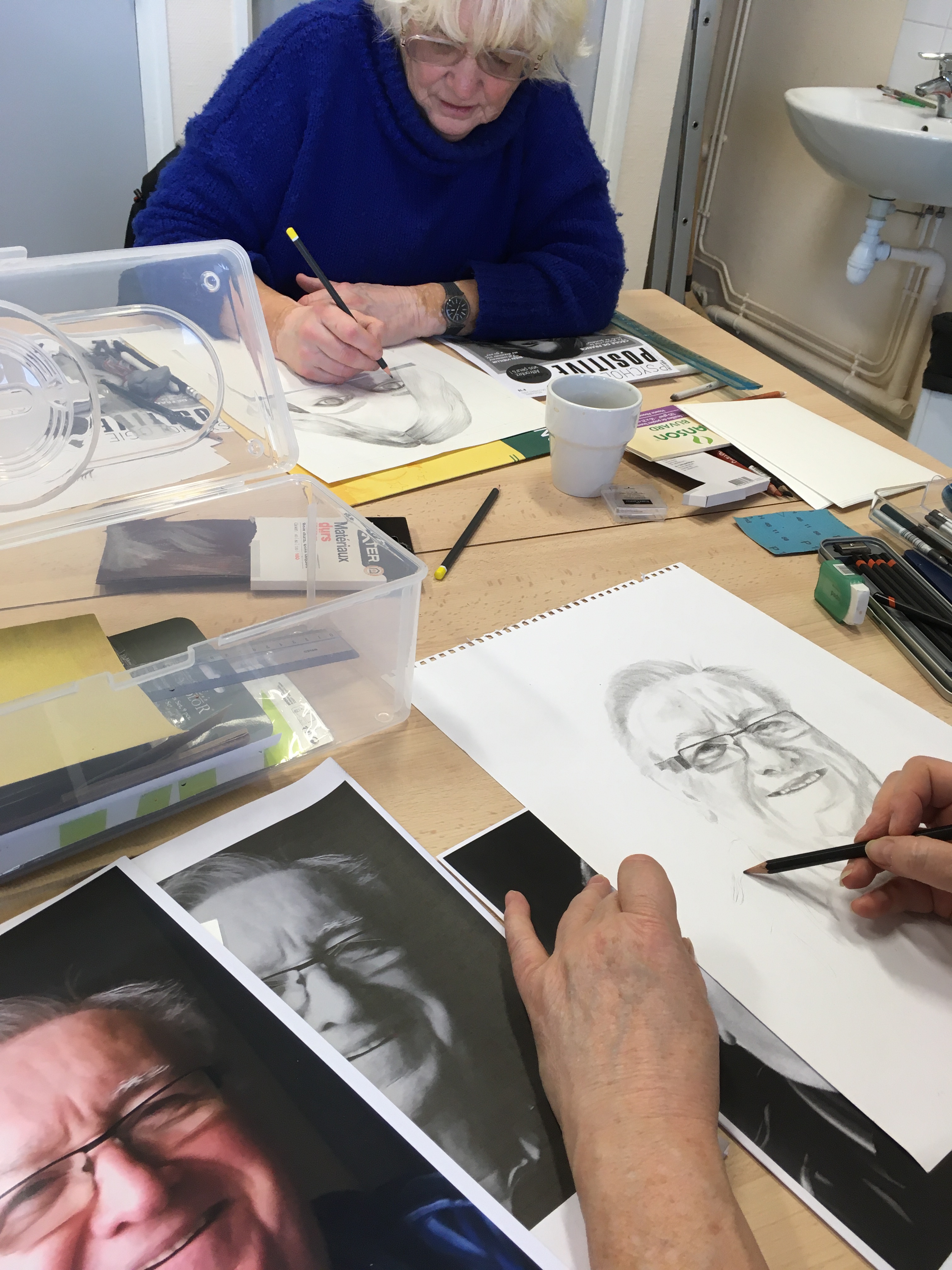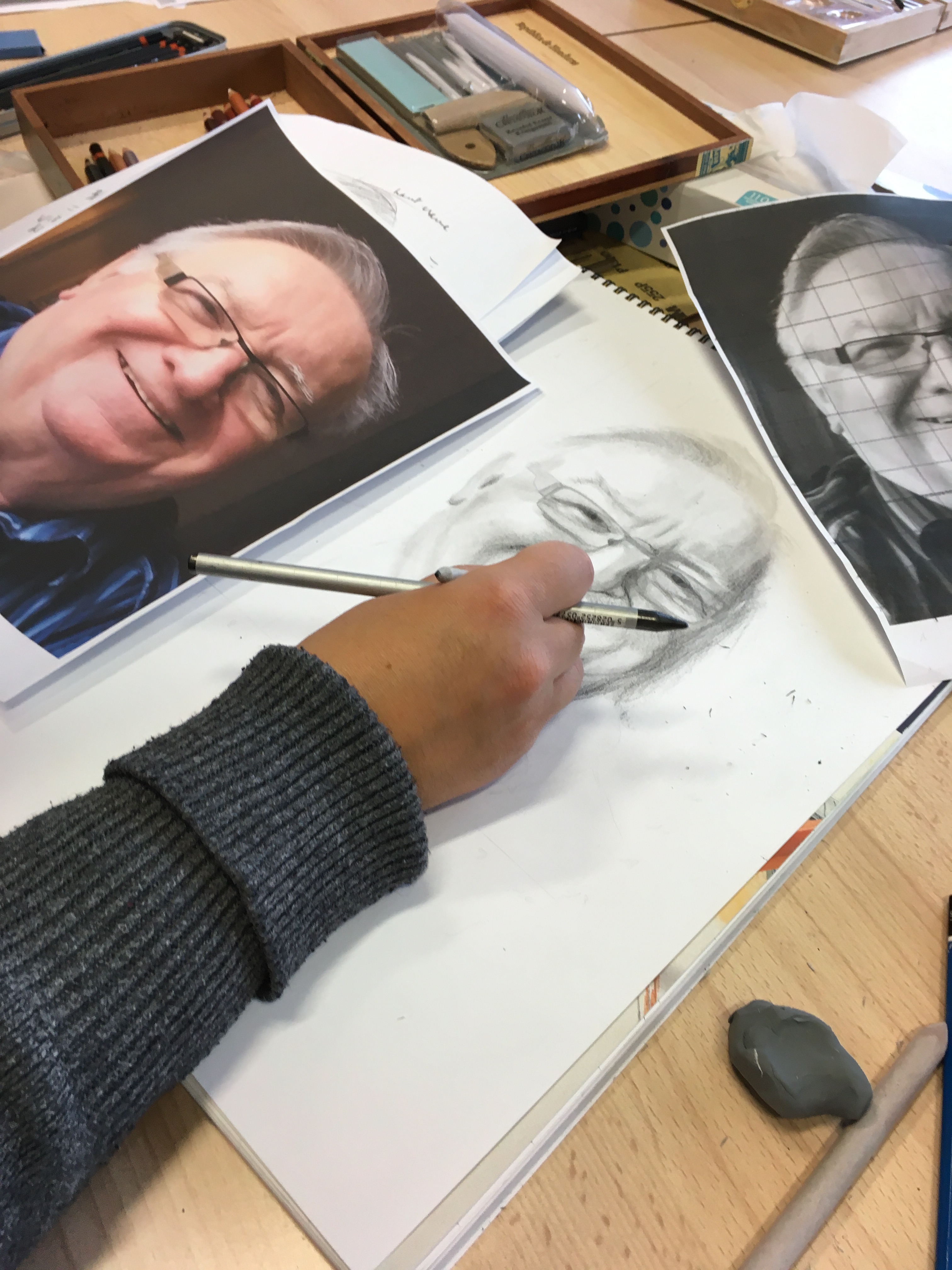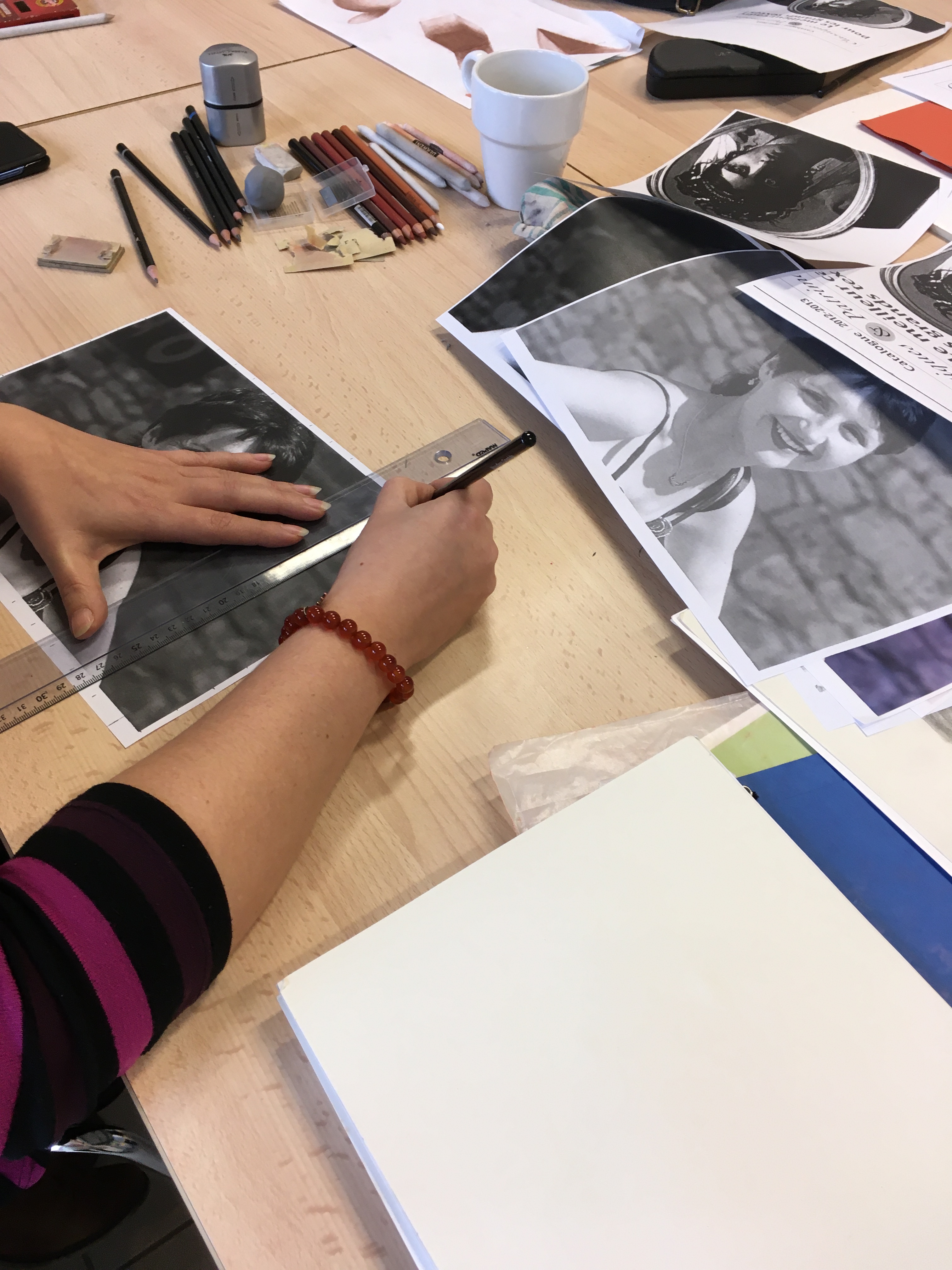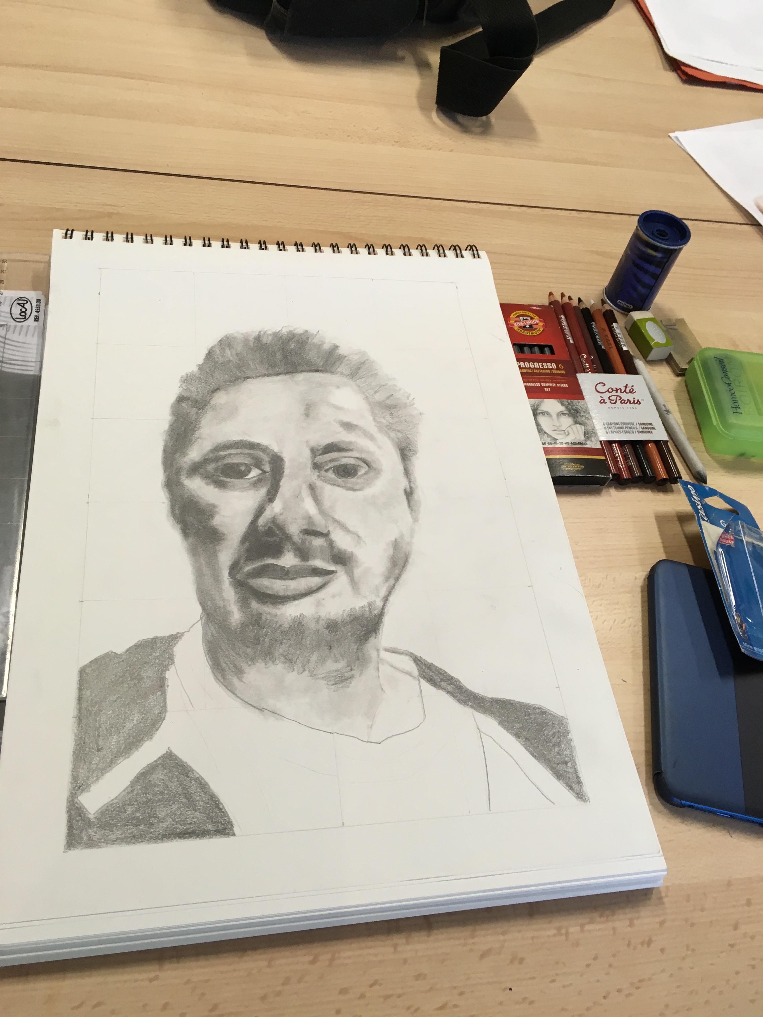 Tout d’abord et pour facilité le travail (le temps nous ai compté !) quadrillage des supports de travail… et aussi quelques photocopies de noir et blanc des visages !