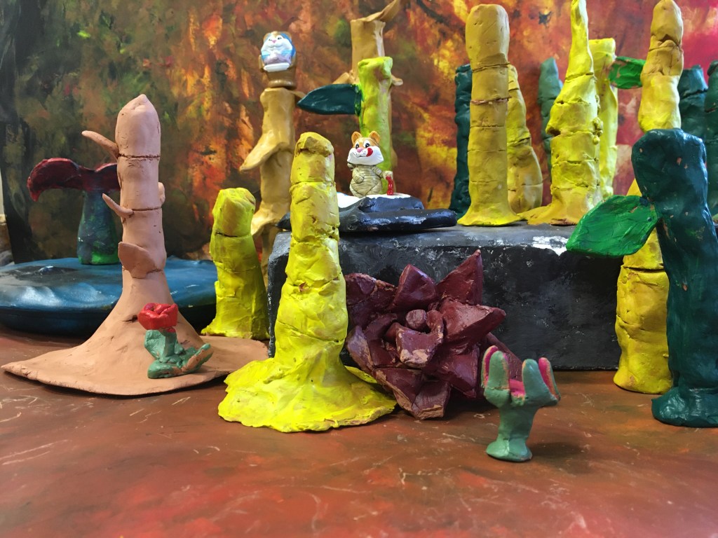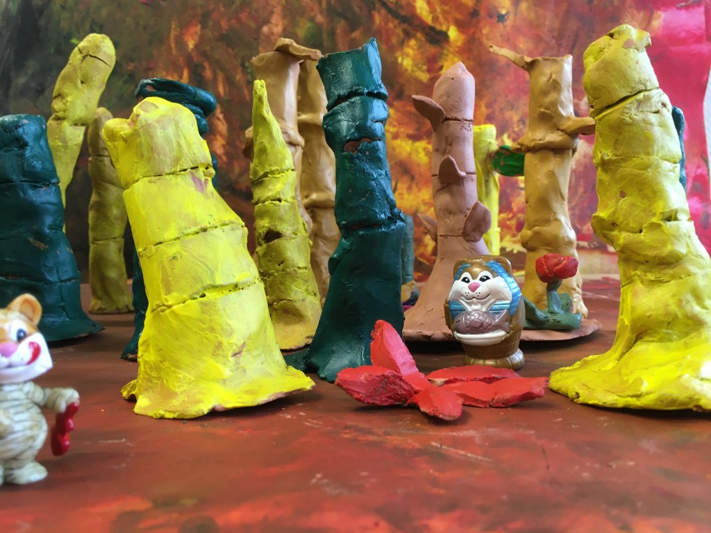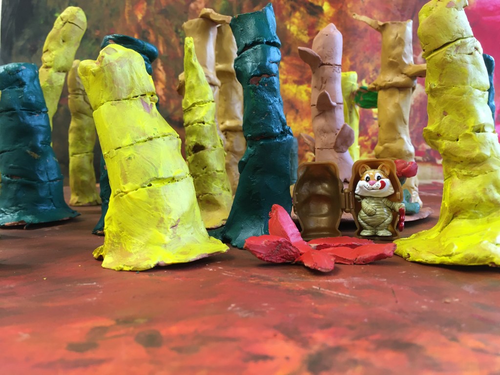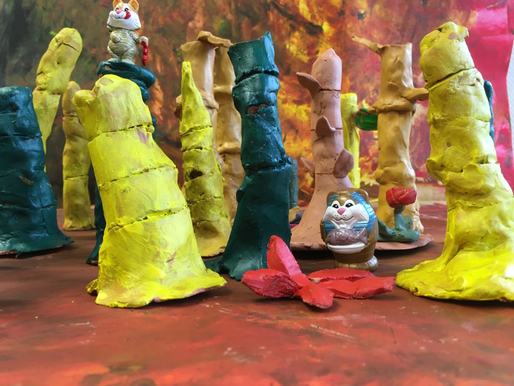 des animaux et d’autres être vivants dans une Forest tout aussi étranges de bambous colorés