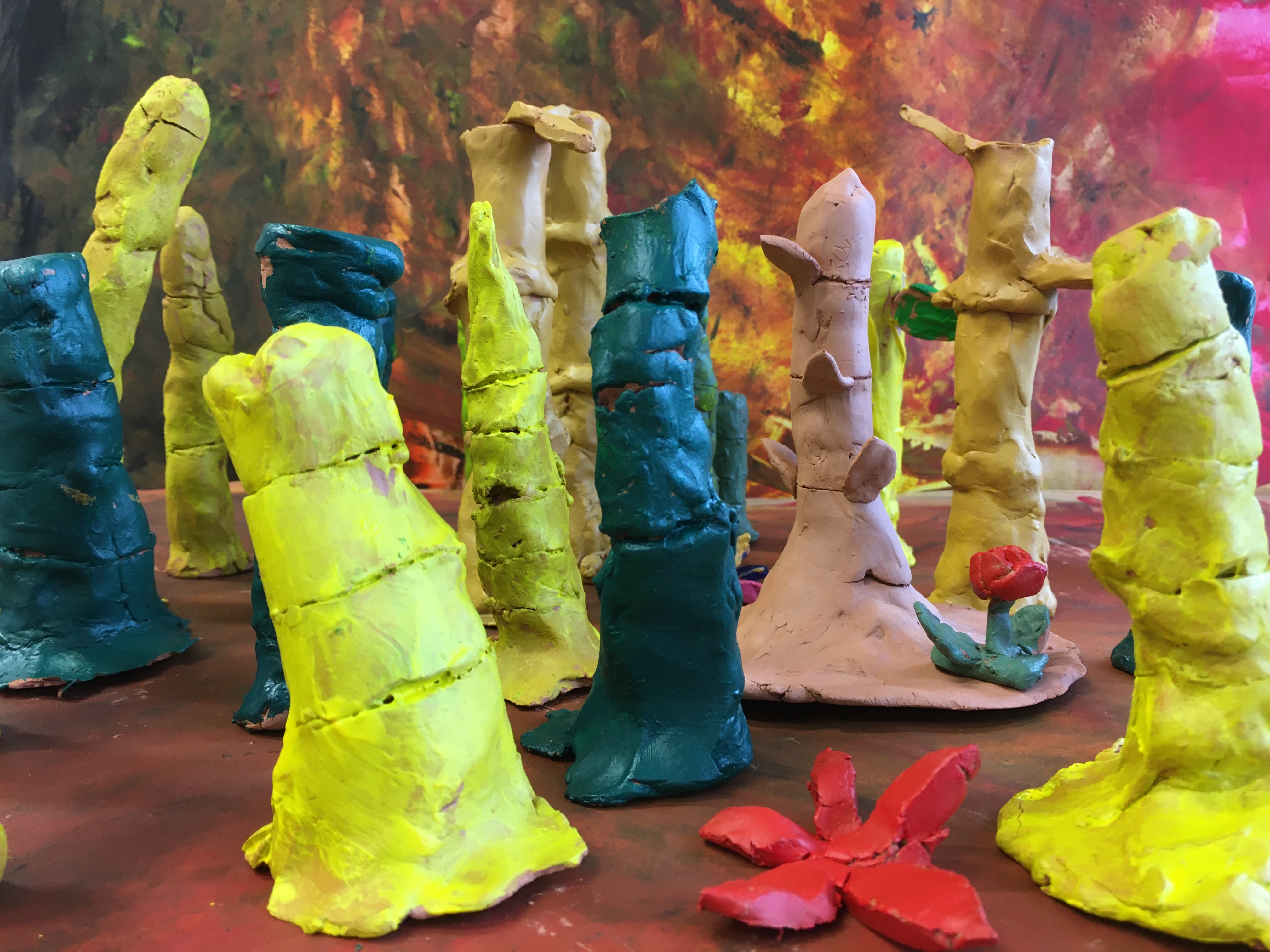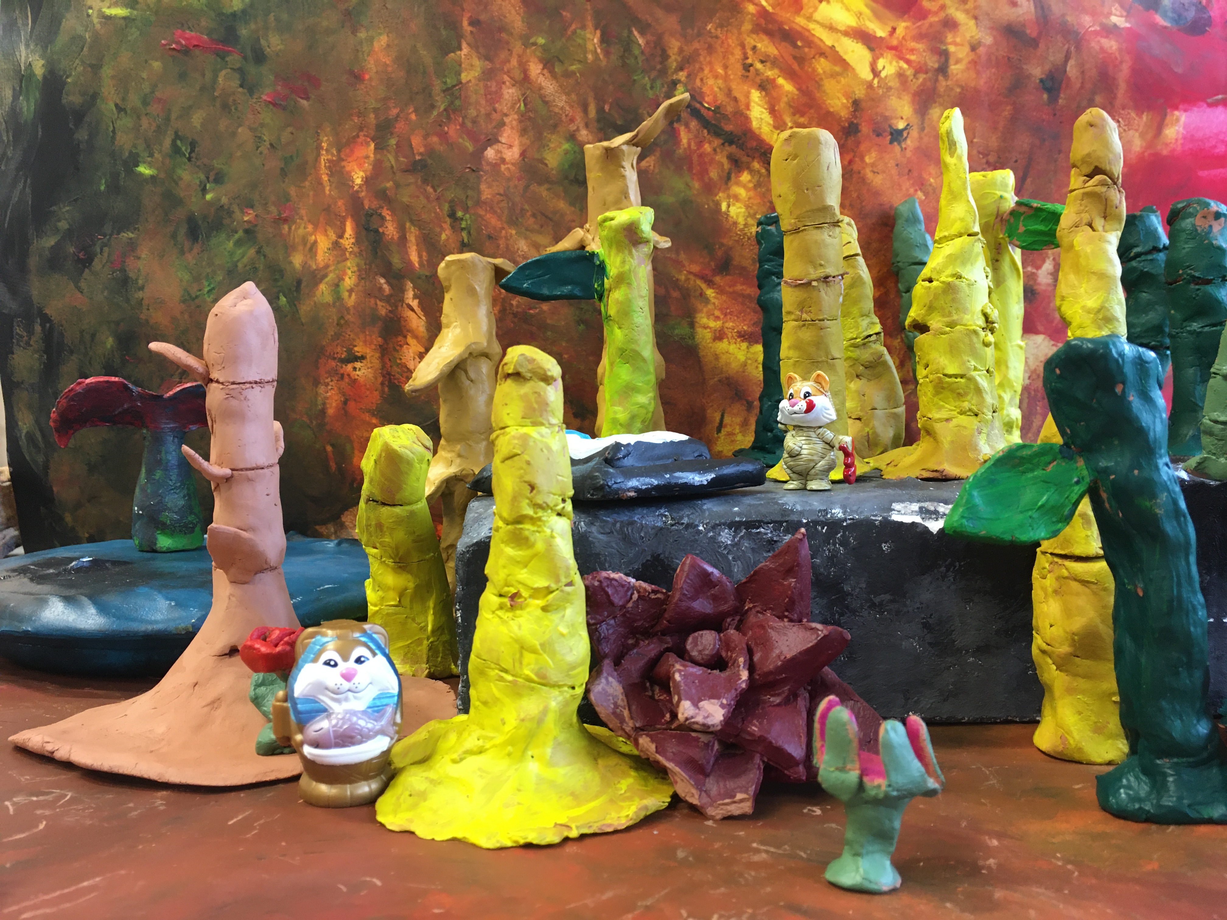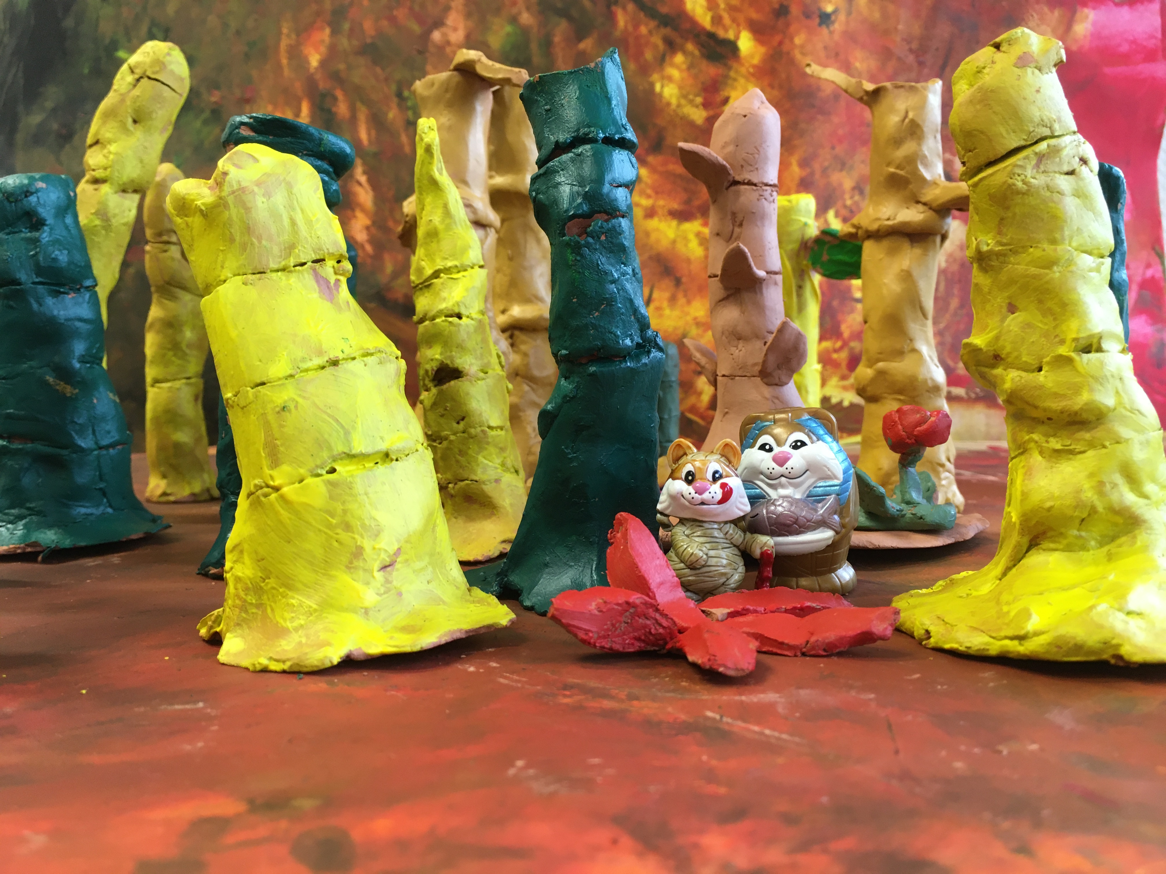des animaux et d’autres être vivants dans une Forest tout aussi étranges de bambous colorés