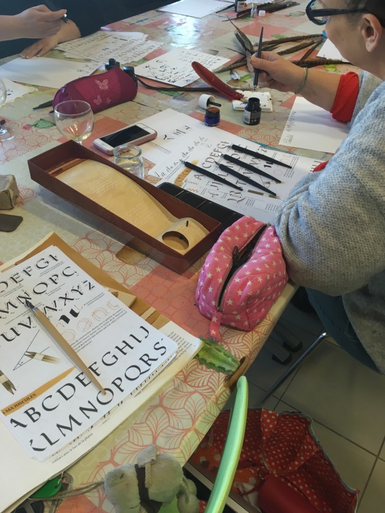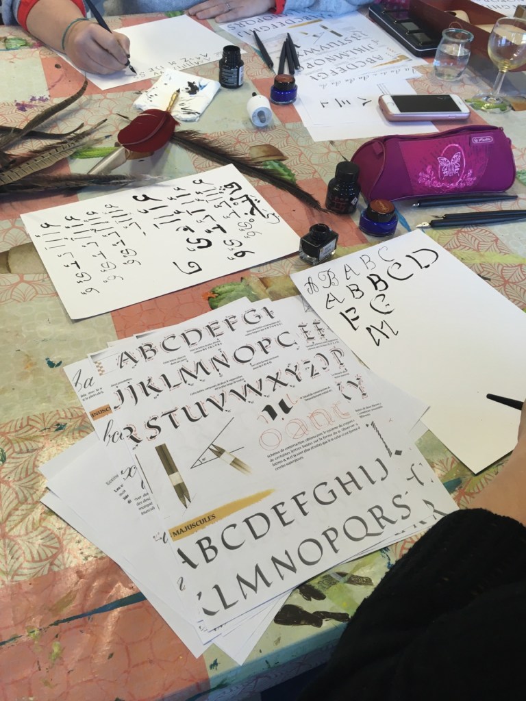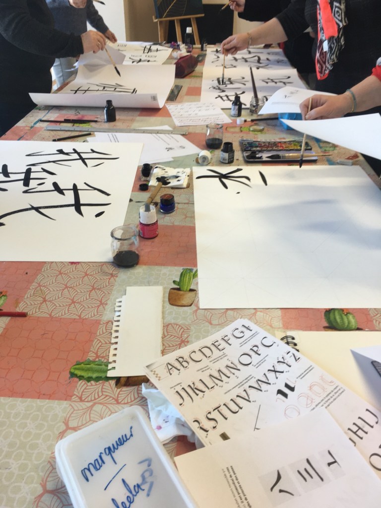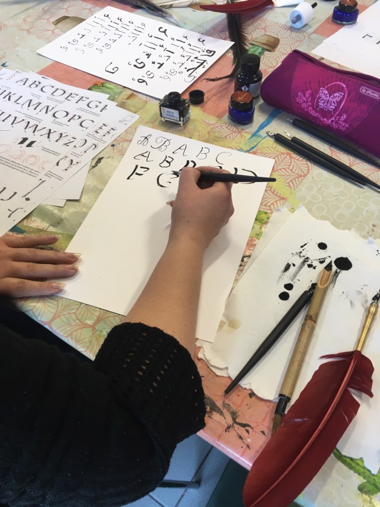 C’est avec 6 participantes que nous avons exploré les outils de calligraphie : la plume d’oiseau, le porte plume, le calame, le pinceau. Une exploration agréable et porteuse d’envie d’aller plus loin ! Sûrement une suite sera proposée dans le futur.
