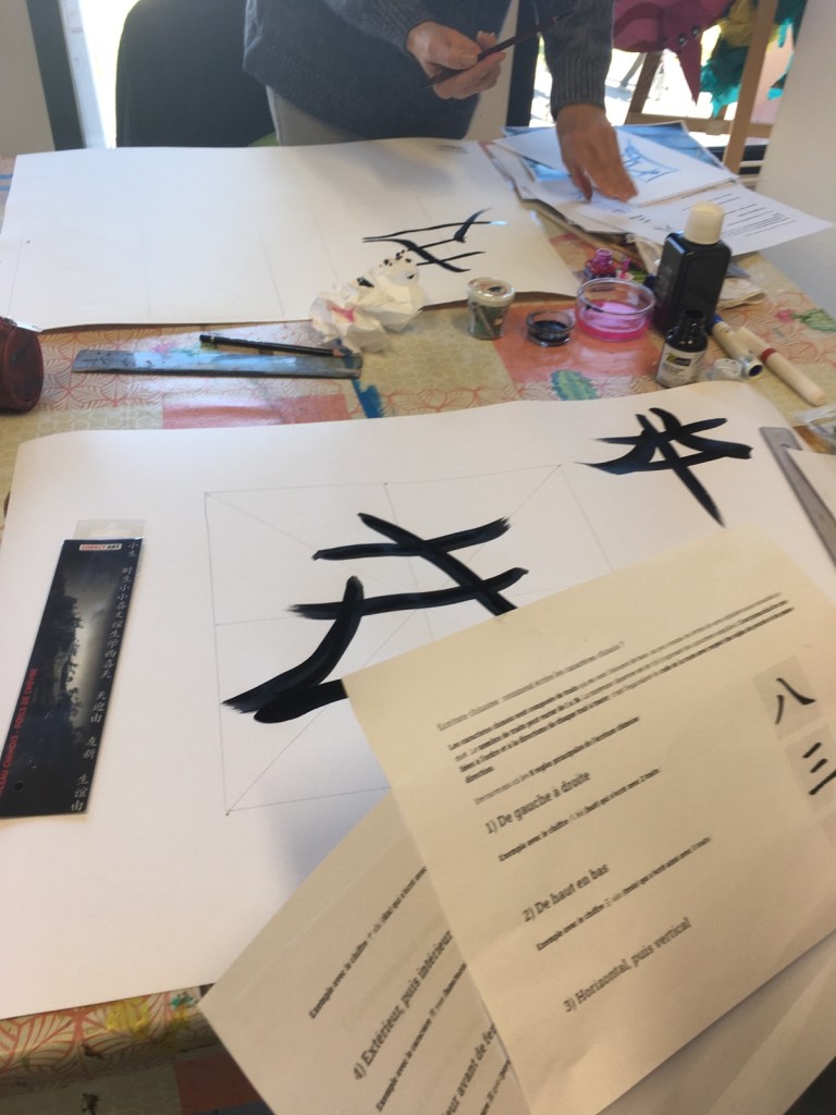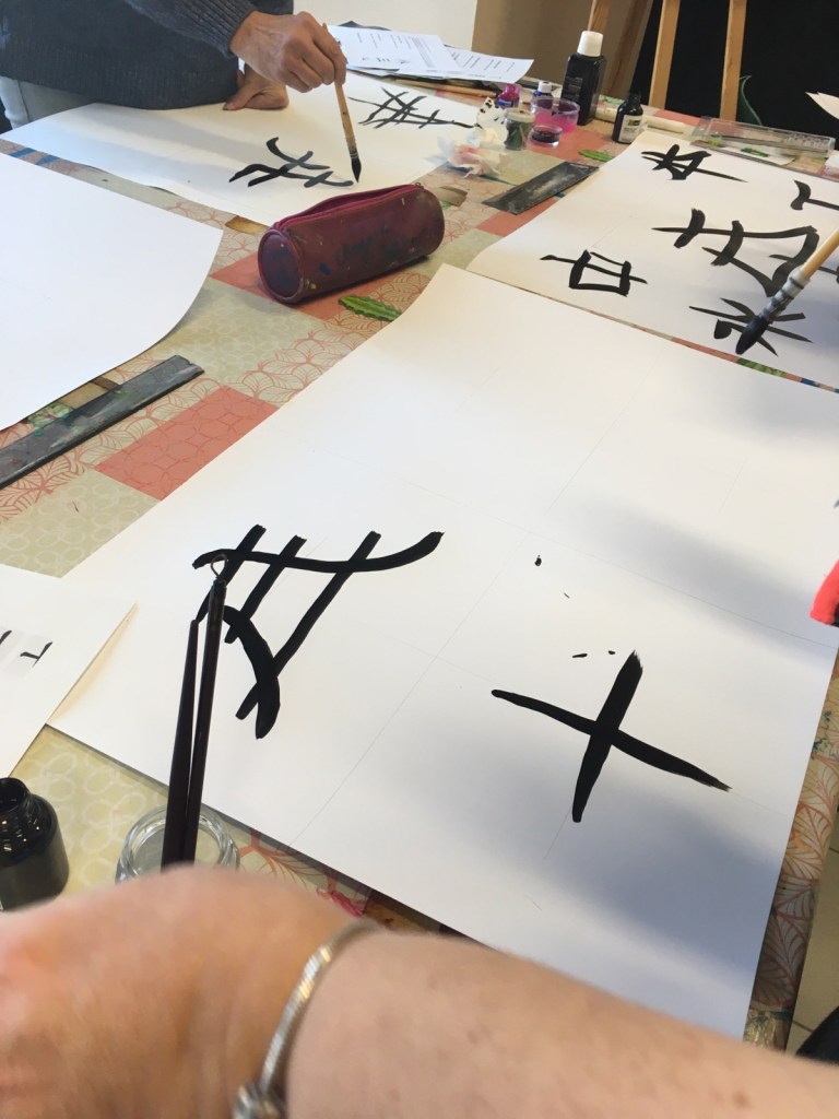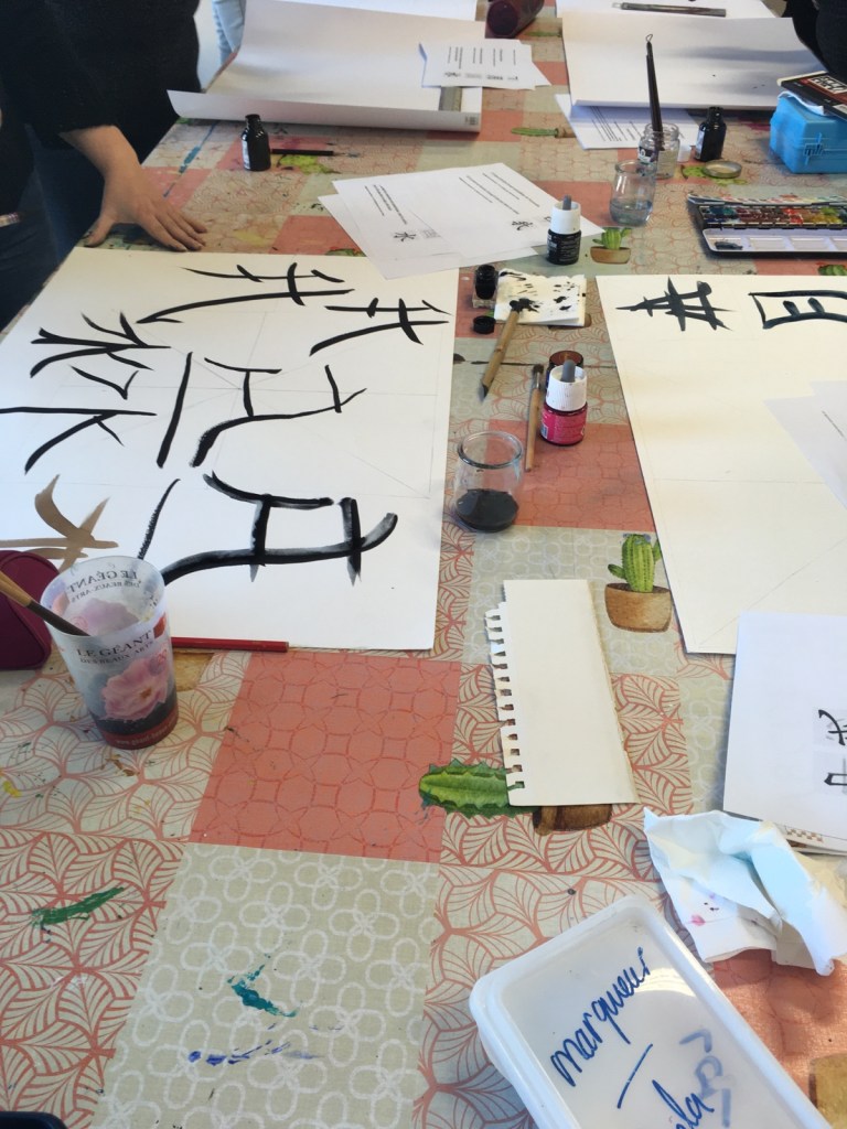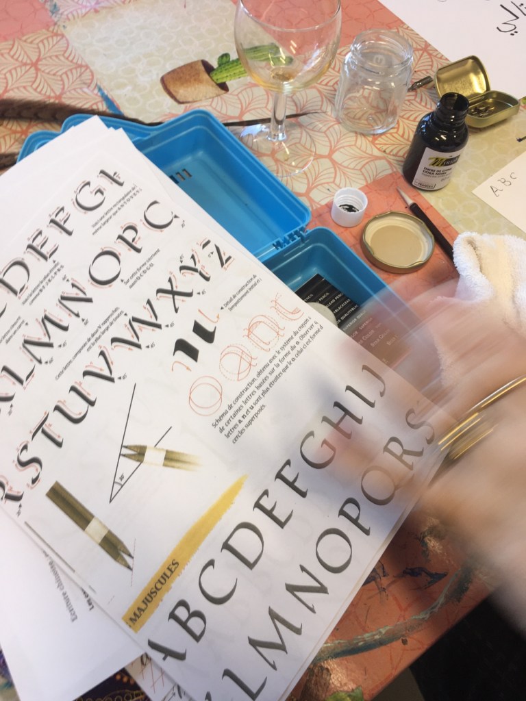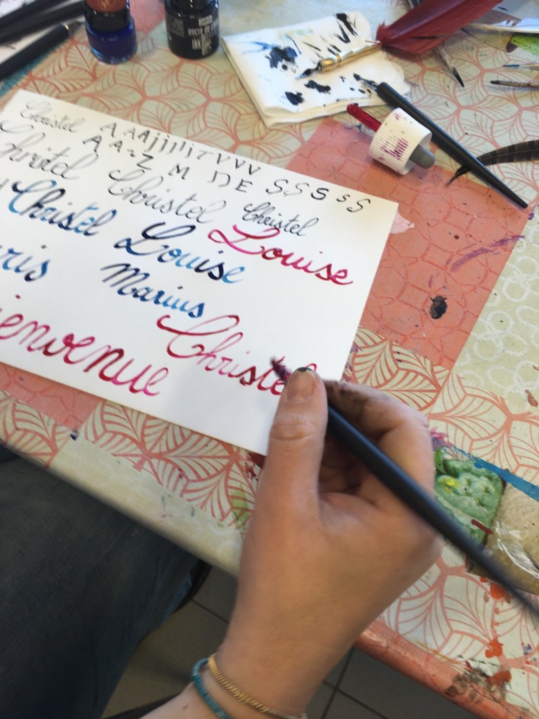 C’est avec 6 participantes que nous avons exploré les outils de calligraphie : la plume d’oiseau, le porte plume, le calame, le pinceau. Une exploration agréable et porteuse d’envie d’aller plus loin ! Sûrement une suite sera proposée dans le futur.