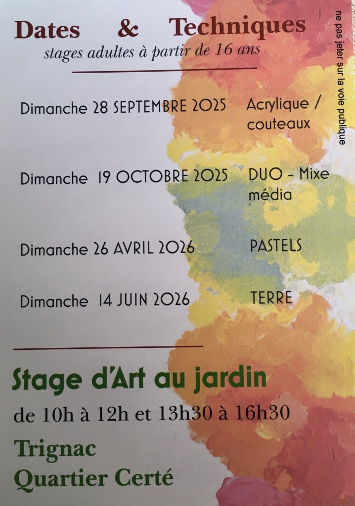 Adultes +16, Stages Stage au jardin 25/26 Date: 8 juillet 2025Author: mdamesonia 0 Commentaires Partager : Partager sur Facebook(ouvre dans une nouvelle fenêtre) Facebook J’aime chargement…